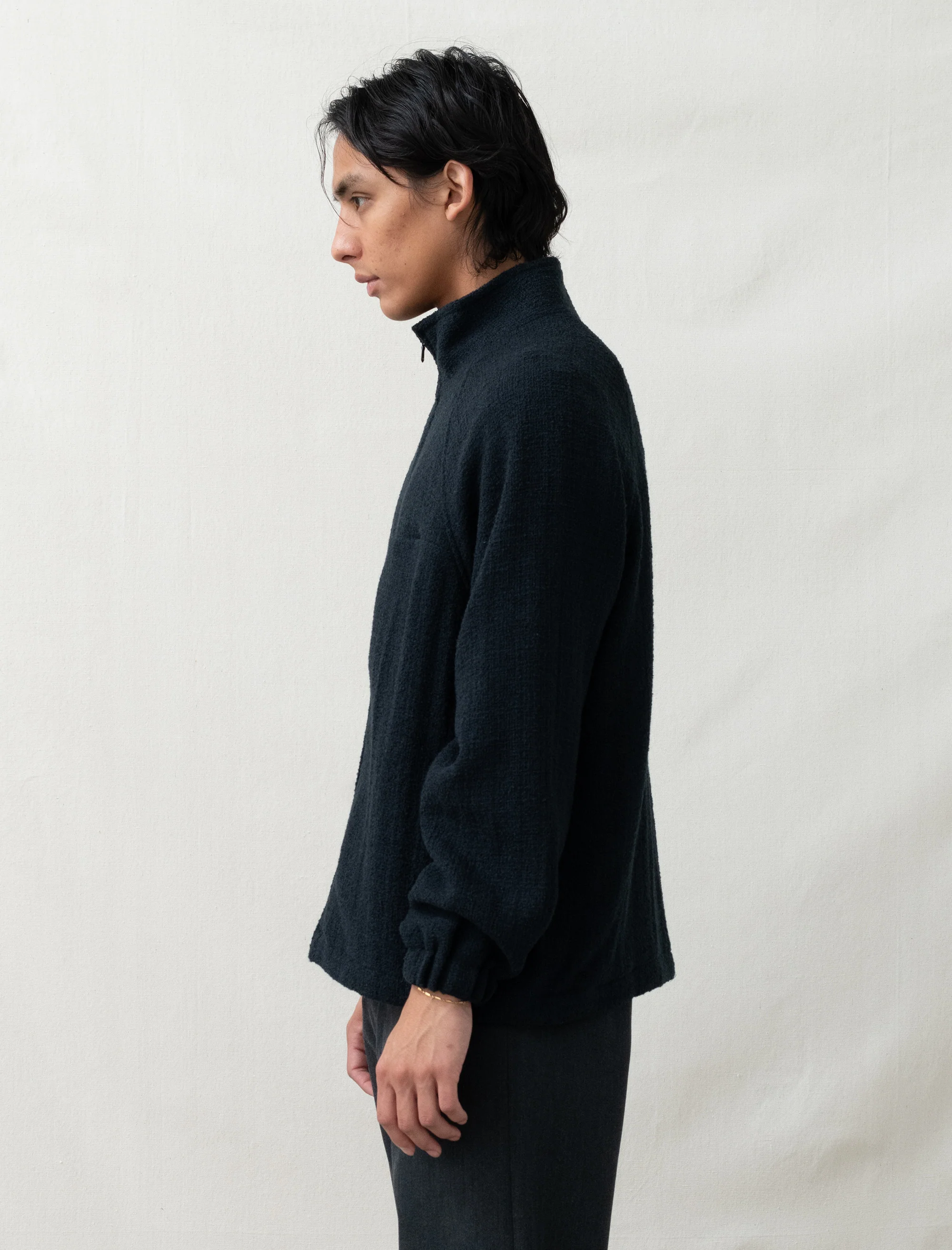 A short, wide-cut jacket made in France from a textured wool-blend cloth in a midnight tone. Designed with a ribbed stand collar, full zip front, and integrated hand pockets set along the side seams. The fabric has a structured, tactile feel, giving the silhouette a clean and functional shape characteristic of Arpenteur’s approach to French workwear.